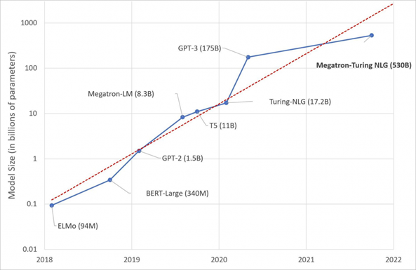 具有大量參數(shù)、更多數(shù)據(jù)和更多訓(xùn)練時(shí)間的語言模型可以獲得更豐富、更細(xì)致的語言理解。此圖描述了隨著時(shí)間的推移,最先進(jìn)的NLP模型的增加。圖表由微軟研究院提供。